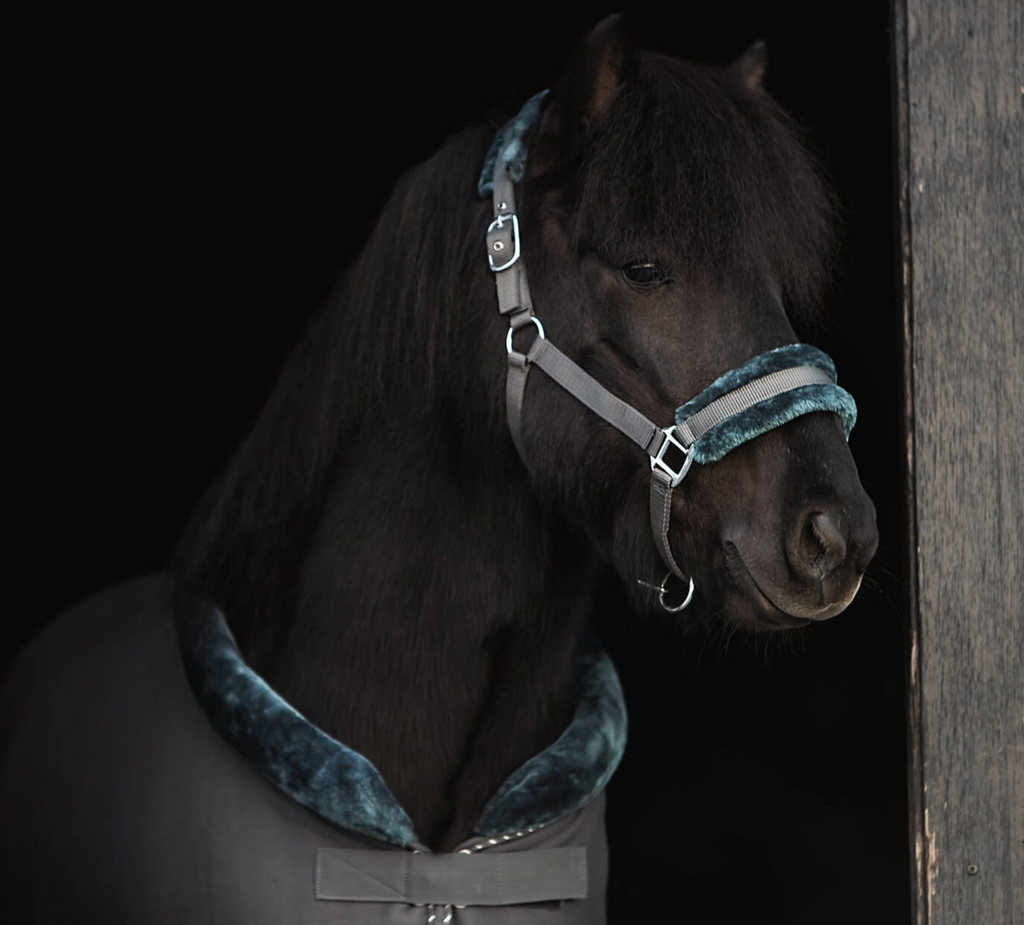 Padded grey nylon halter with silver fittings. This halter is adjustable at the poll and noseband, featuring plush padding in a gray/green tone for maximum comfort for the horse. The distinctive TOP REITER logo is woven into the design, giving the halter its unmistakable appearance. The halter comes as a set, including a 2-meter lead rope with panic snap.