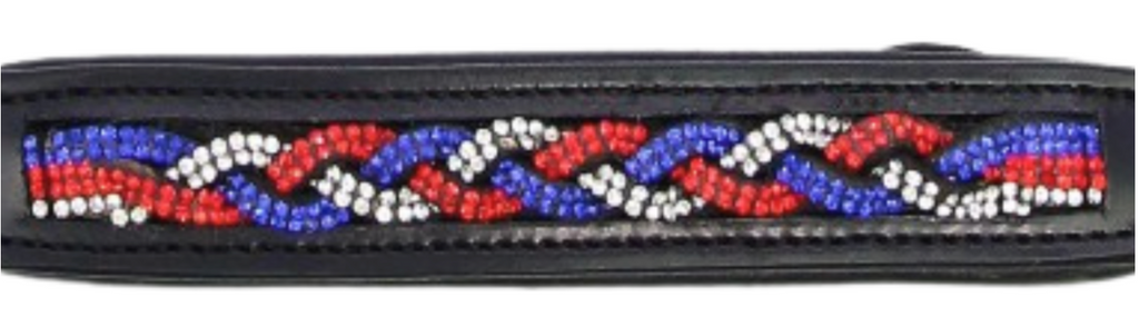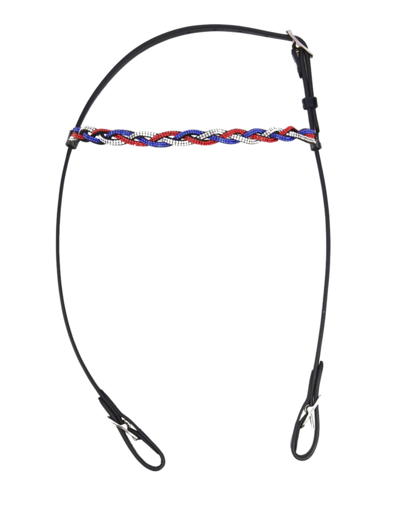 Headstall and a matching dropped noseband with a braided browband and rows of Red, White and Blue colored stones. Silver fittings.
